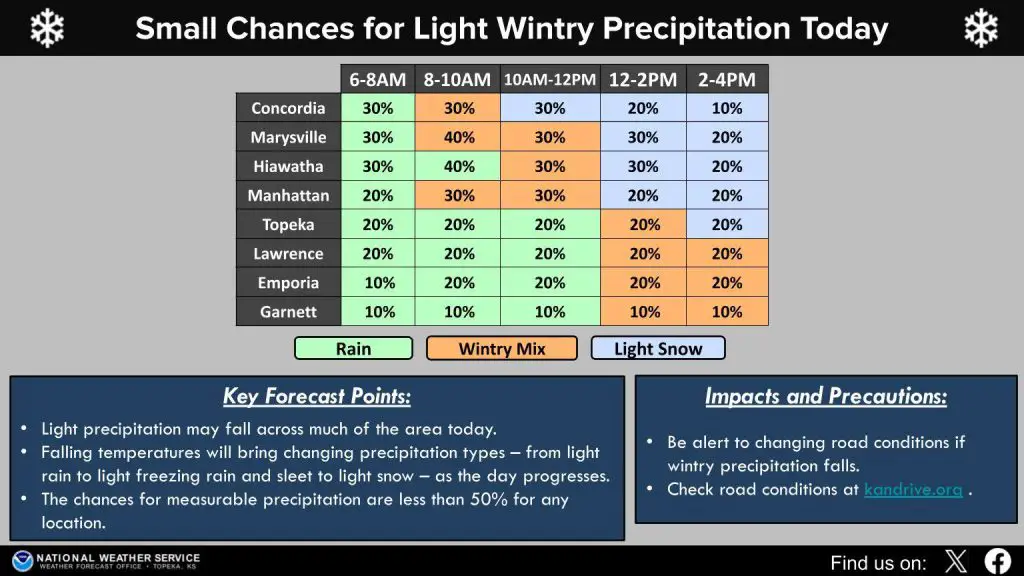 Forecasters say the timing and intensity of the system remain limited, but even light precipitation could create slick spots as temperatures drop. Residents should be alert to changing road conditions, especially during the afternoon and evening hours when any wintry mix may develop.